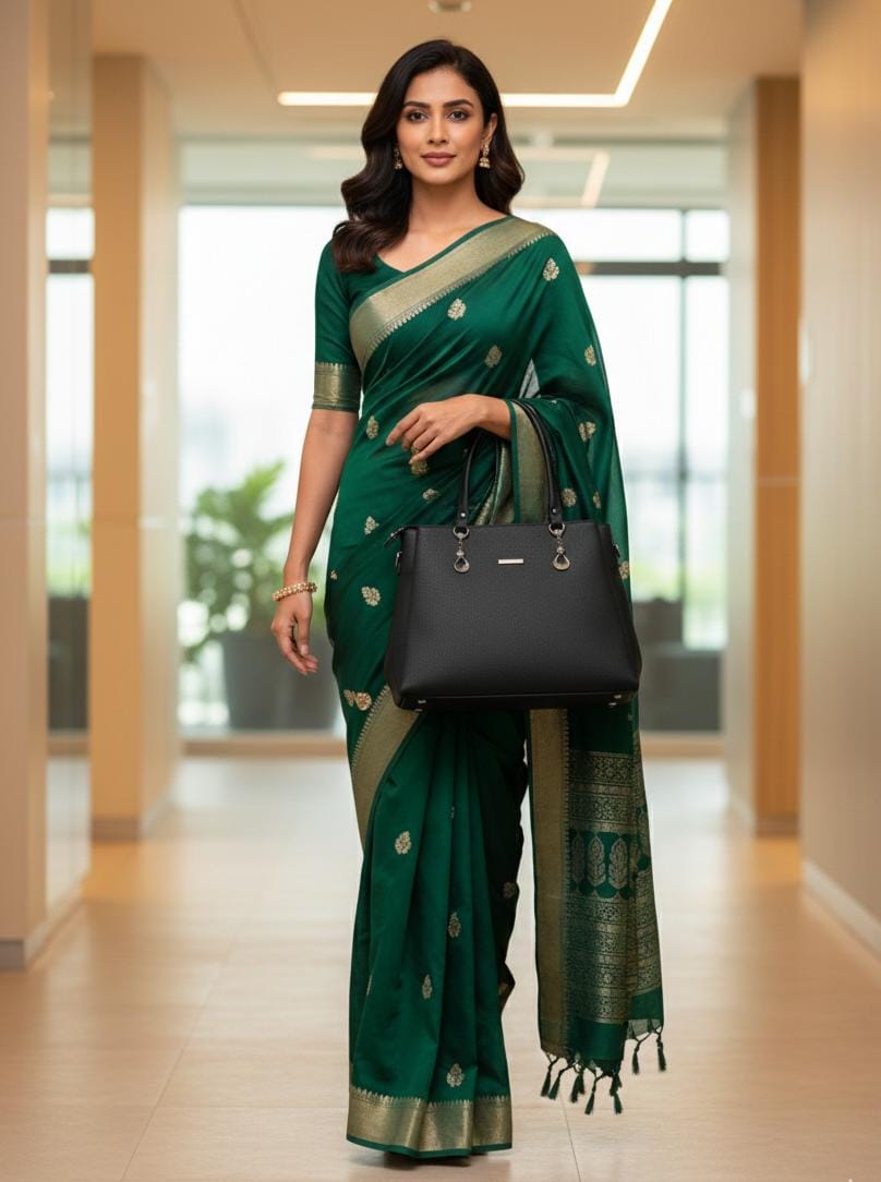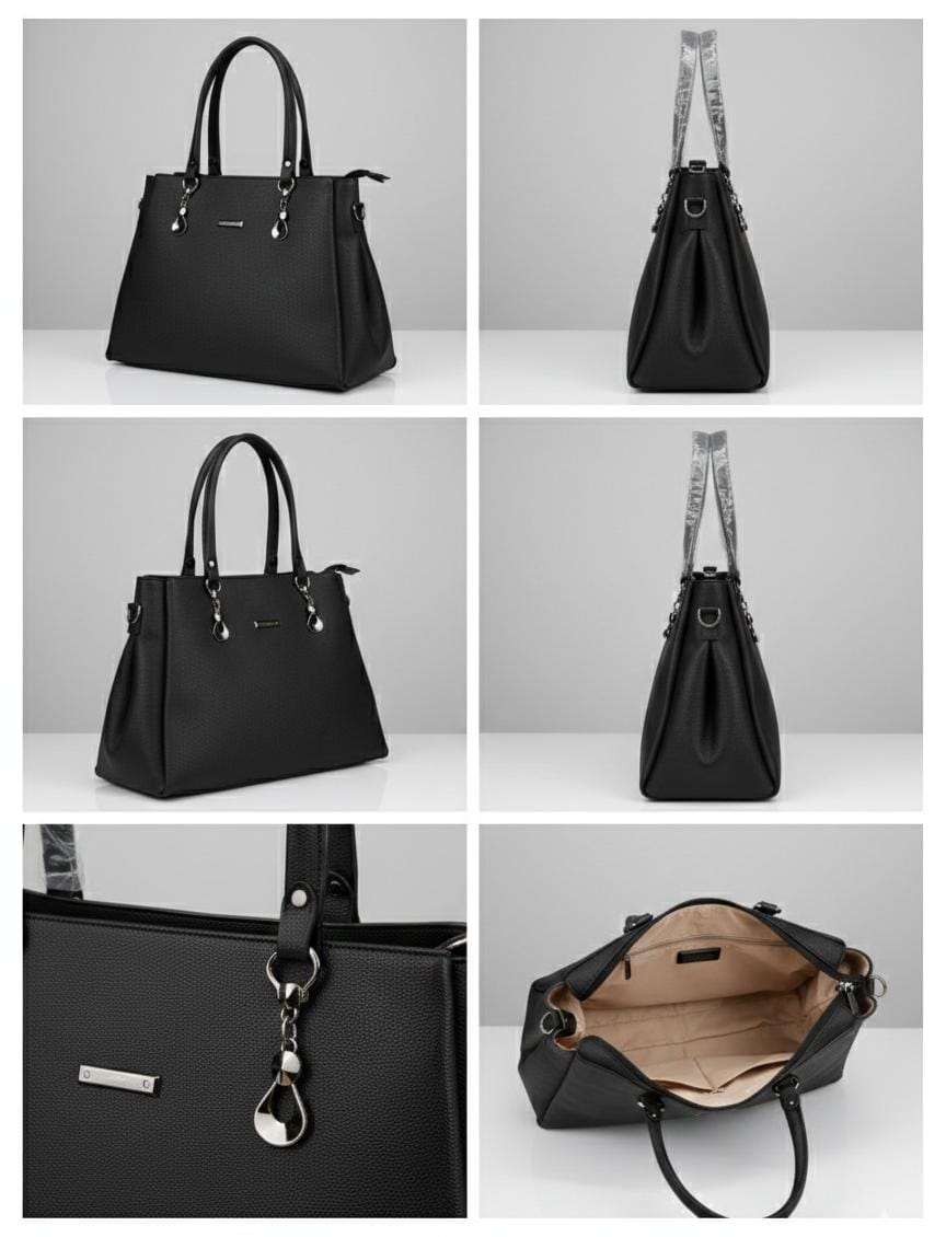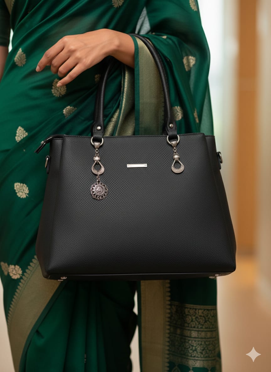 Stylish black handbag with textured finish and metal charm details. Perfect for ethnic and formal wear, spacious and classy.