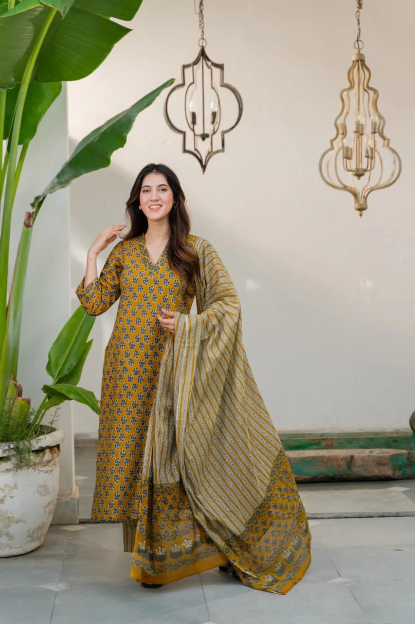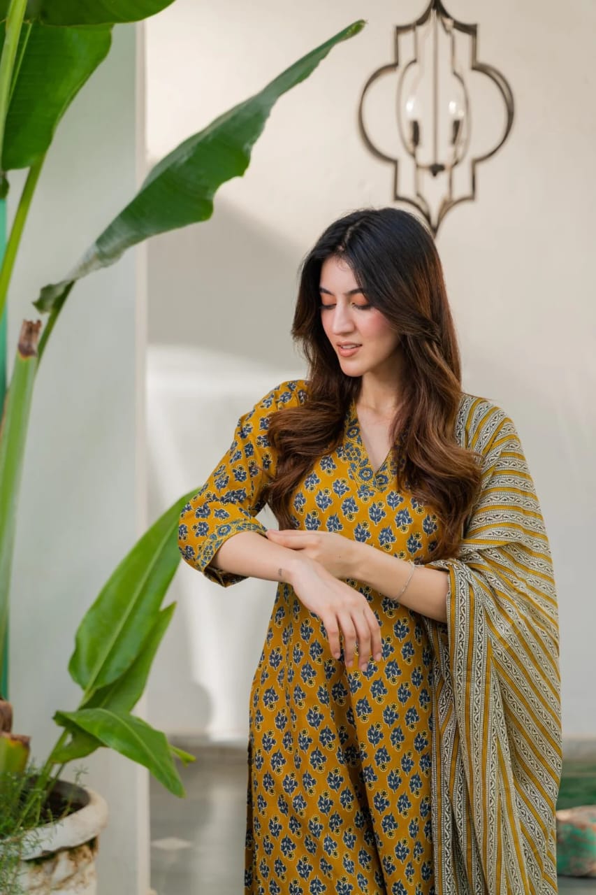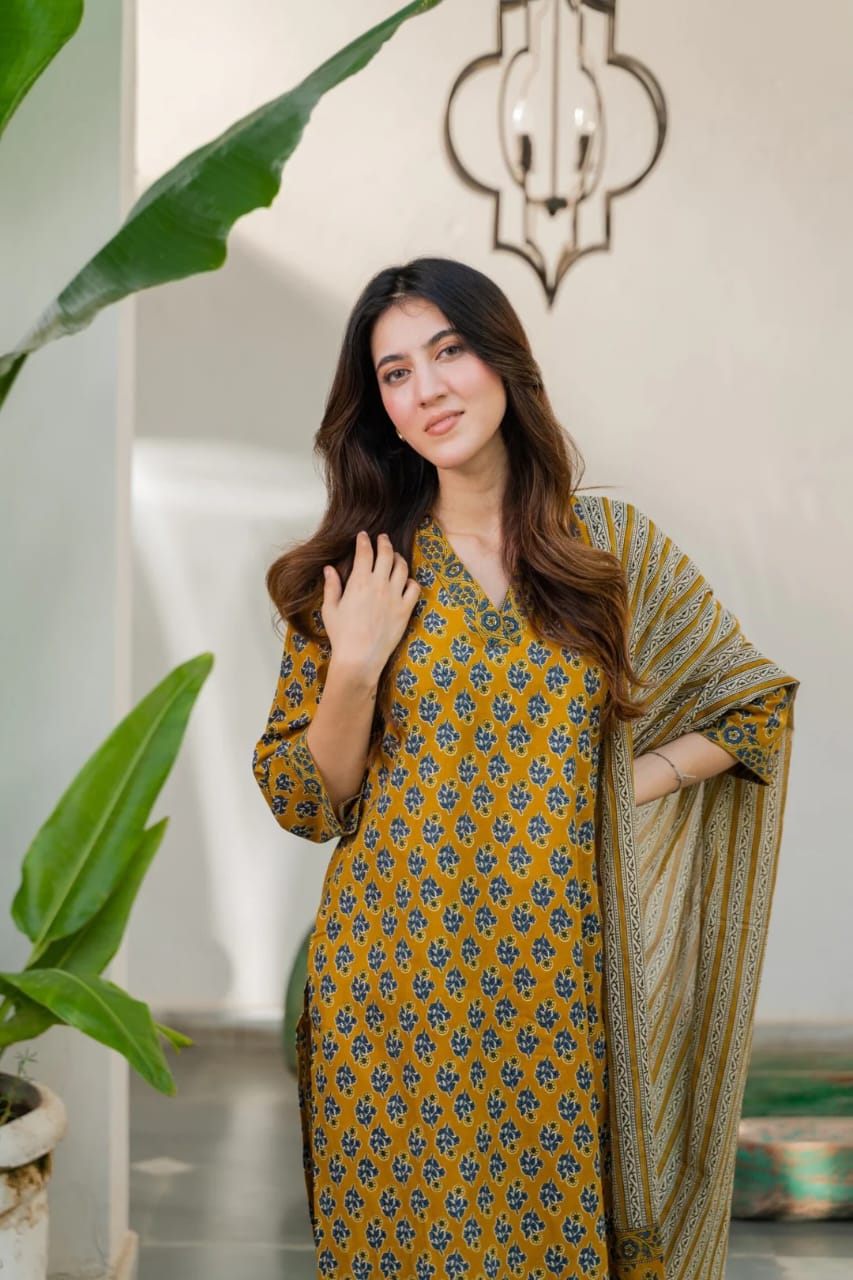 Step into effortless elegance with this Mustard Yellow Grace Kurta Bottom Dupatta Set, crafted from soft and breathable Rayon Slub fabric. Featuring a timeless printed design, comfortable straight pants, and a lightweight flowing dupatta, this set is perfect for daily wear, office wear, and festive occasions.