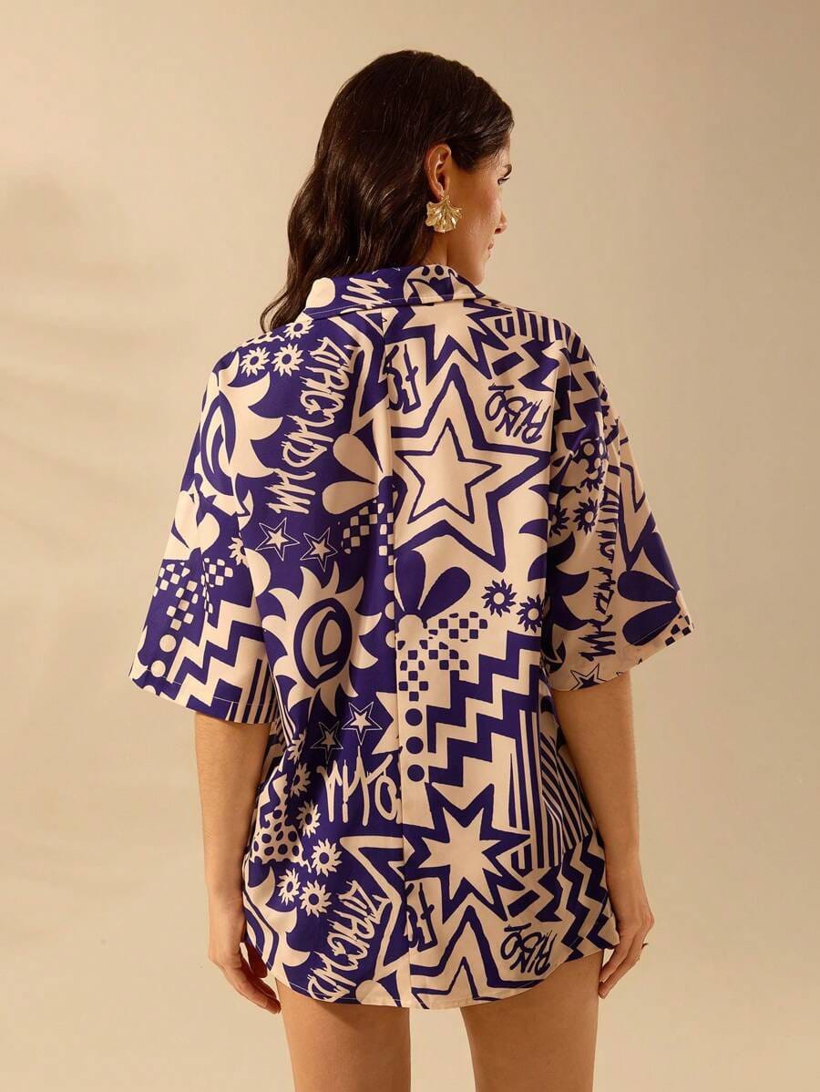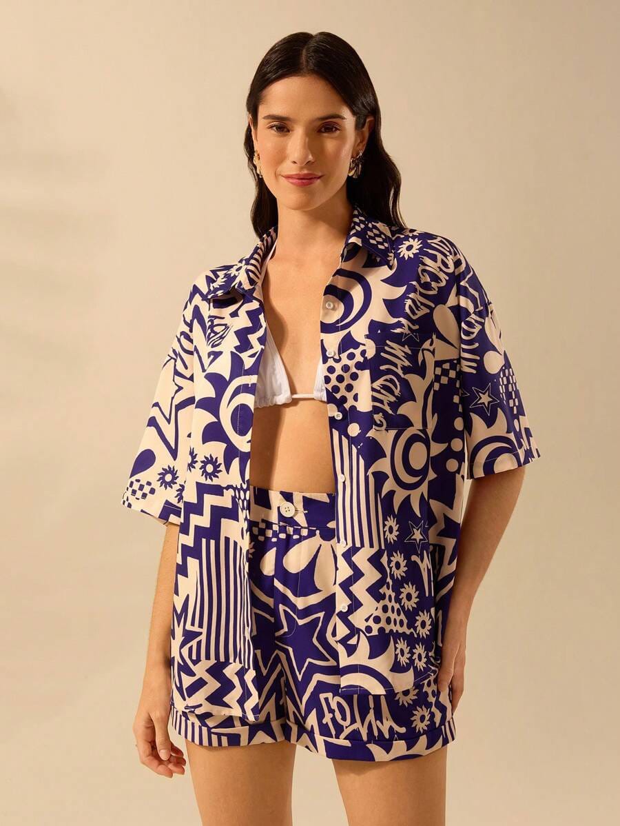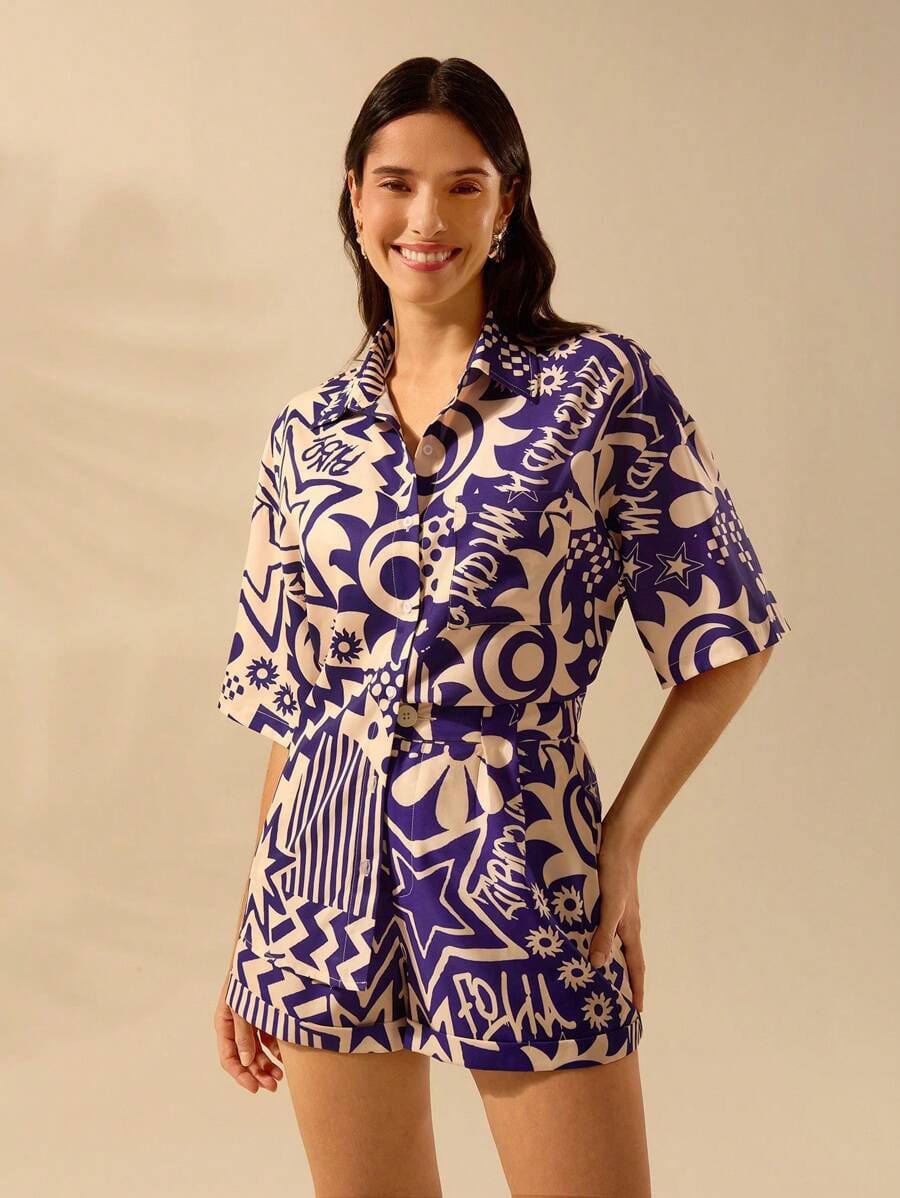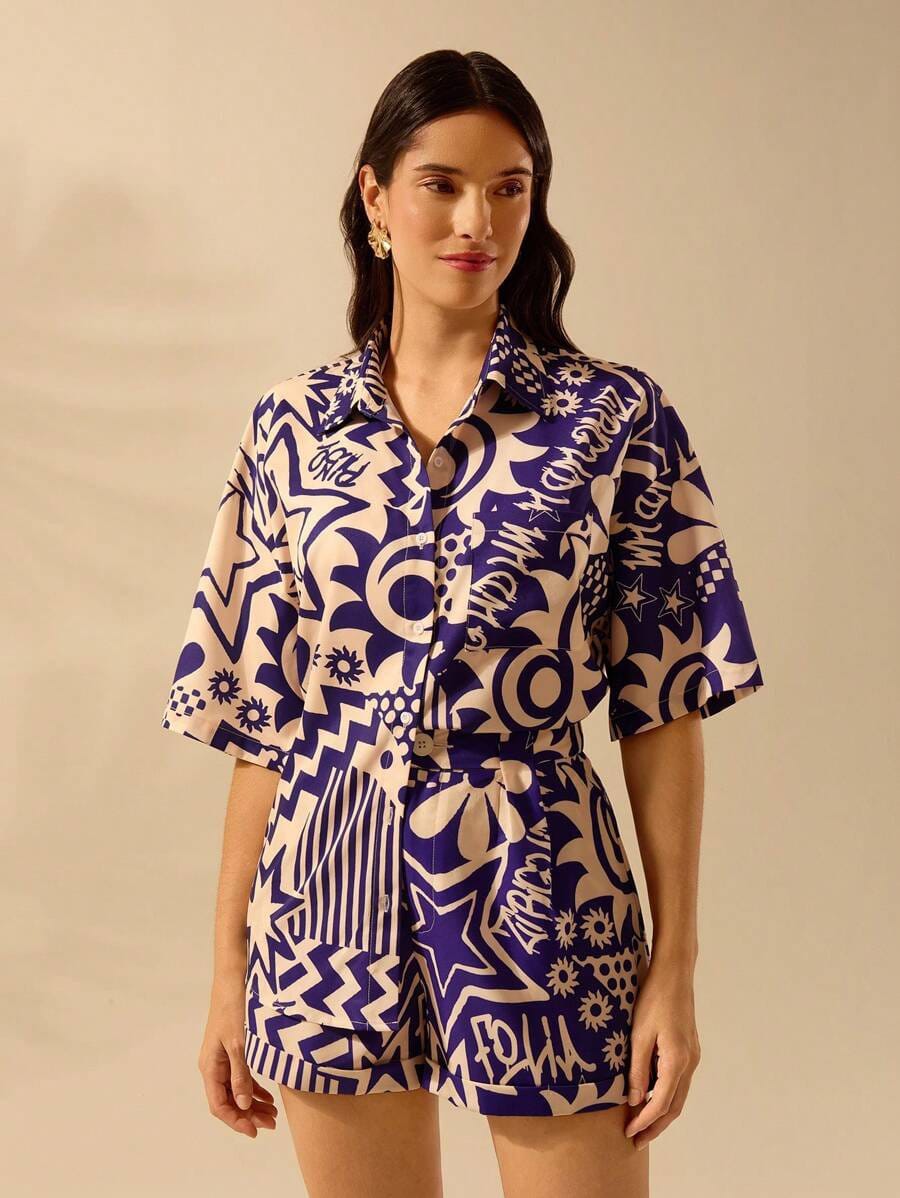 This stylish royal blue and ivory co-ord set features a bold abstract print that gives a modern, fashion-forward look. The half-sleeve button-down shirt offers a relaxed silhouette, while the matching high-waist shorts ensure comfort with effortless style. Crafted from soft, breathable fabric, this co-ord set is perfect for vacations, beach days, resort wear, and casual outings. Pair it with minimal accessories and flats or sneakers for a chic contemporary vibe.