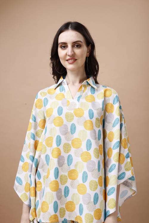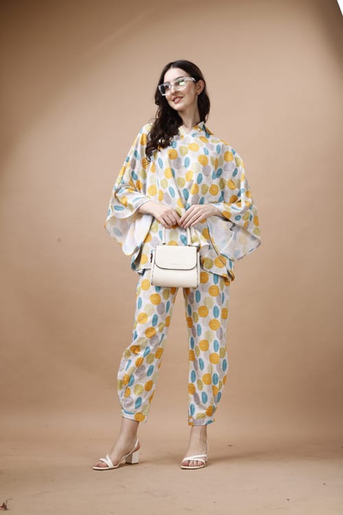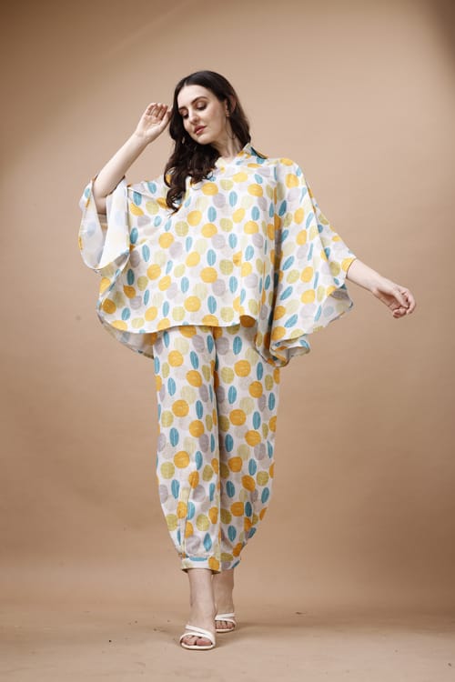 Special designer evening stylish co-ord set for ladies featuring a trendy yellow and blue dot print. Made from soft and comfortable cotton blend fabric with a modern and elegant look — perfect for outings, parties, and casual evenings.