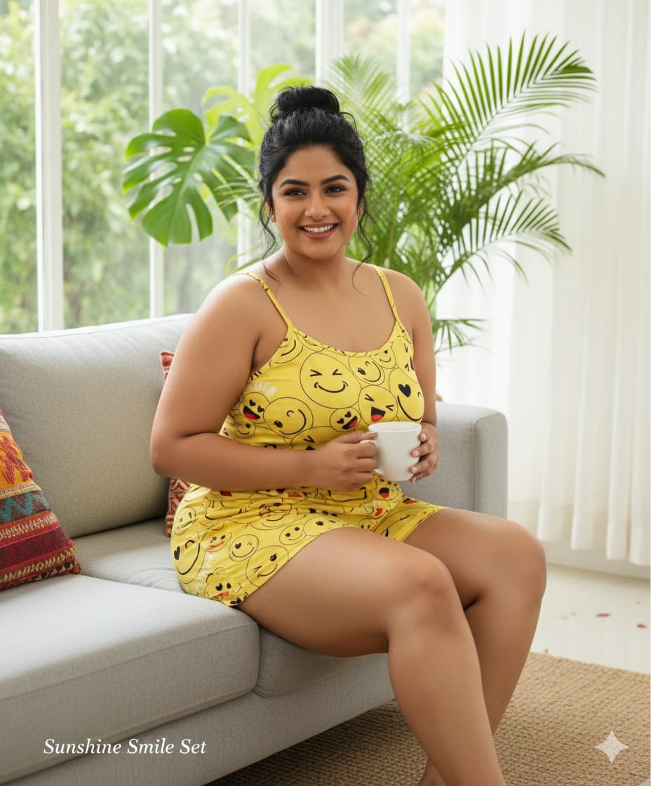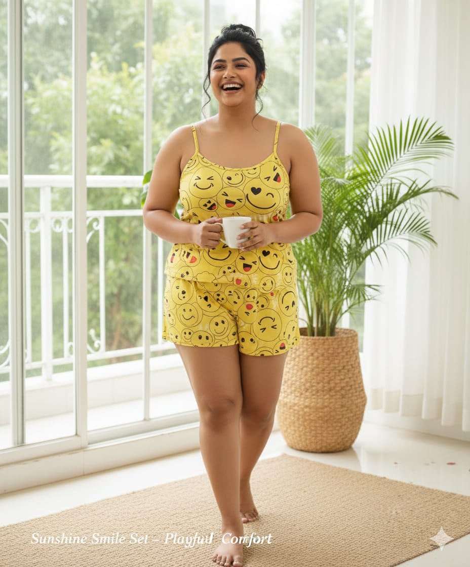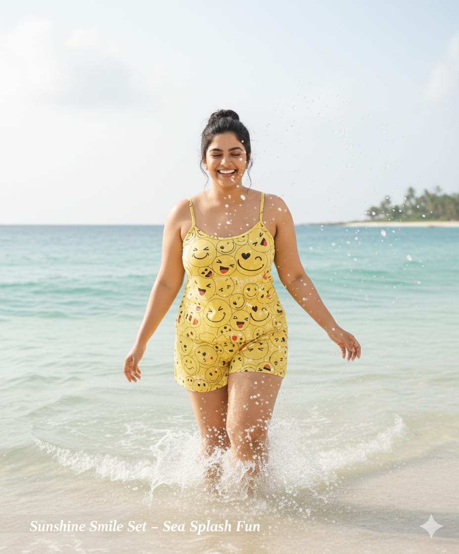 Add a playful vibe to your beach wardrobe with this sunshine yellow satin beach wear co-ord set. Featuring a cheerful smiley print design, this lightweight and silky satin outfit includes a comfortable sleeveless top with spaghetti straps and matching shorts.