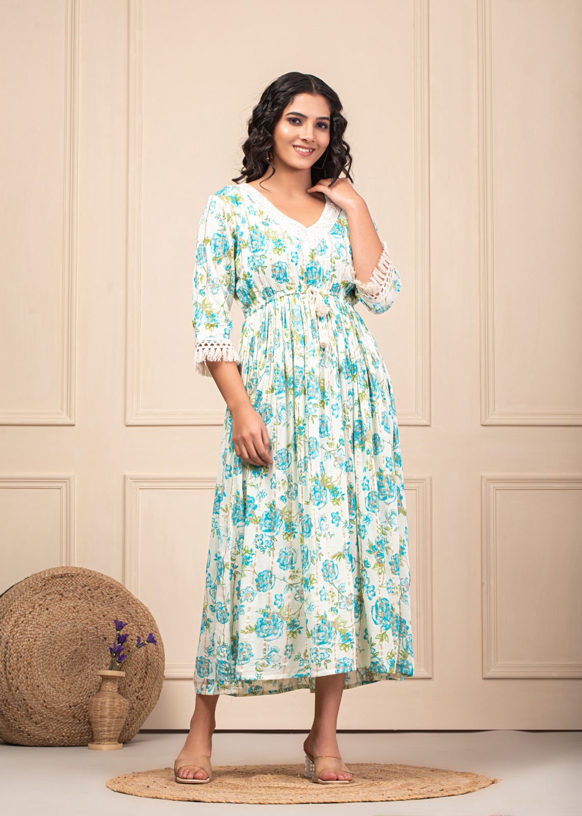 Introducing our Women’s Rayon Flower Printed Knee Length Frilled Sleeves Dress, a perfect addition to your wardrobe! Crafted with care using premium rayon fabric, this dress offers both comfort and style. The frilled sleeves add a touch of femininity, making it a charming choice. With its delicate flower print, this dress is fashionable and trendy. Elevate your look effortlessly with this lightweight and gracefully crafted dress.