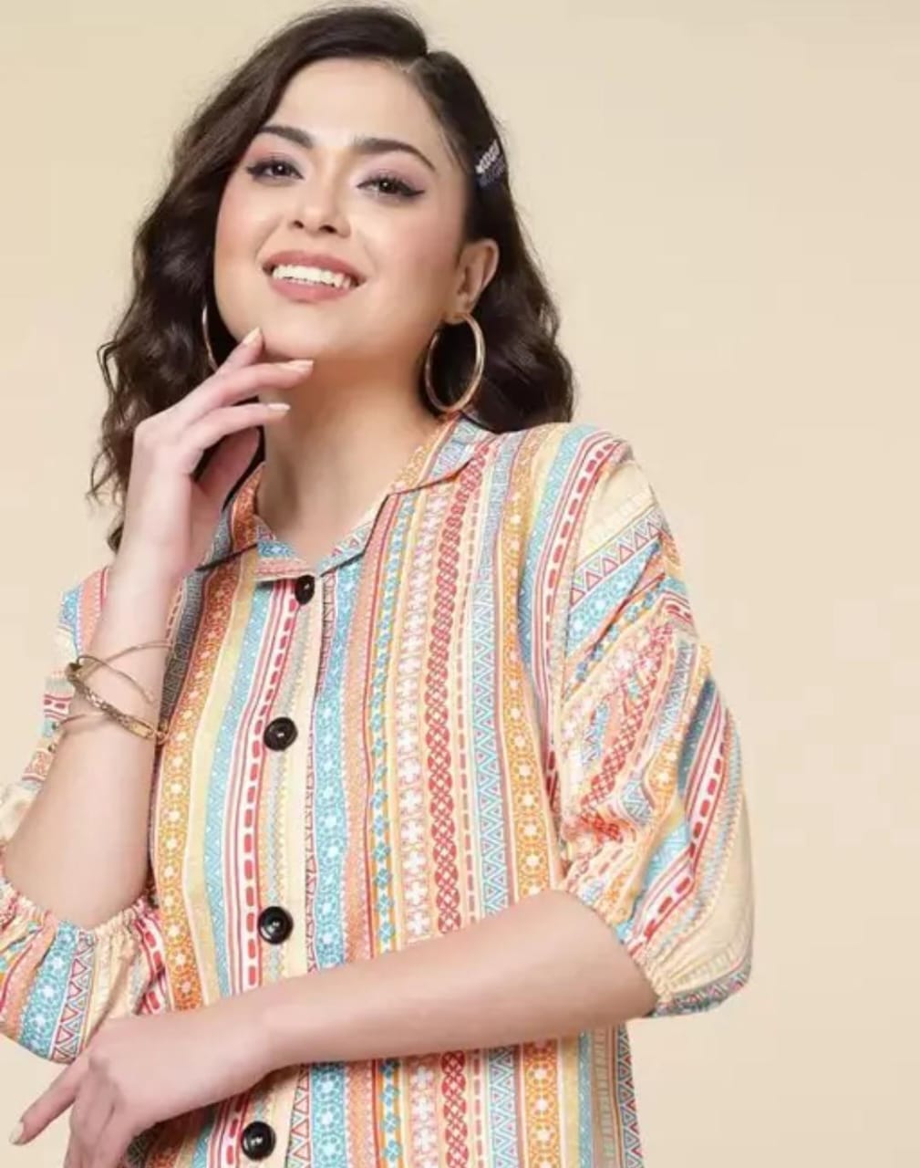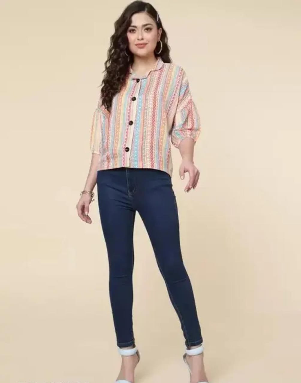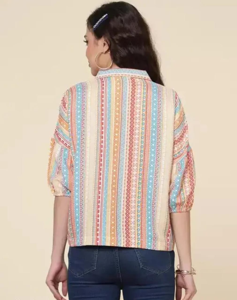 This stylish multicolor striped top features a soft cream base with vibrant vertical patterns that add a fresh and playful touch. Made from a comfortable cotton blend fabric, it offers a relaxed fit with puff sleeves, making it perfect for everyday casual and smart-casual looks.