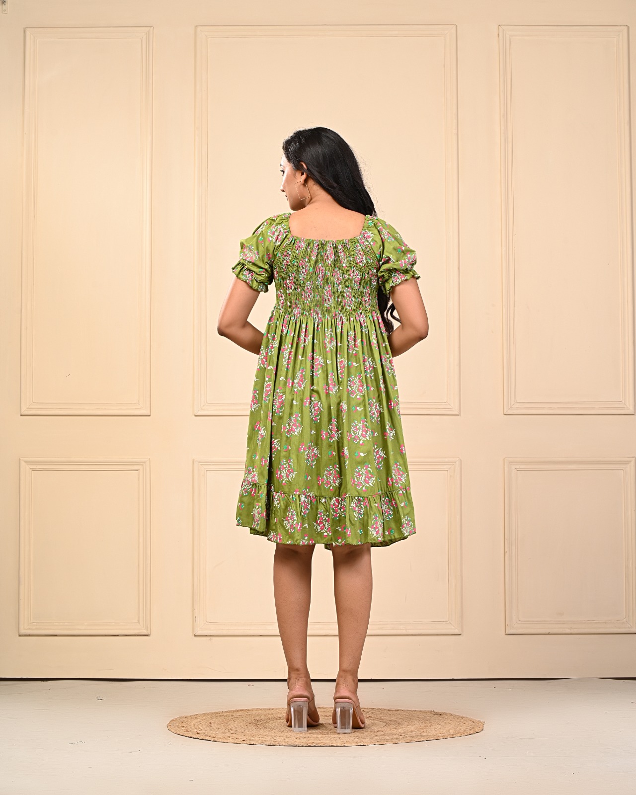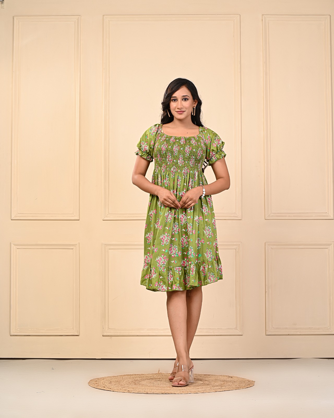 Add a touch of feminine charm to your wardrobe with this beautiful magenta Green floral smocked midi dress. Designed to flatter all body types, this dress features a fully smocked bodice that offers a snug yet stretchy fit, enhancing your silhouette comfortably. The flowy midi-length skirt drapes elegantly, making it perfect for warm-weather outings or casual gatherings.