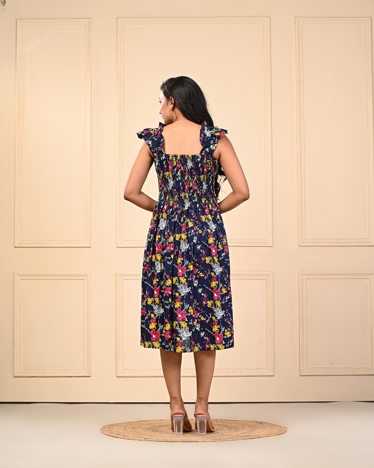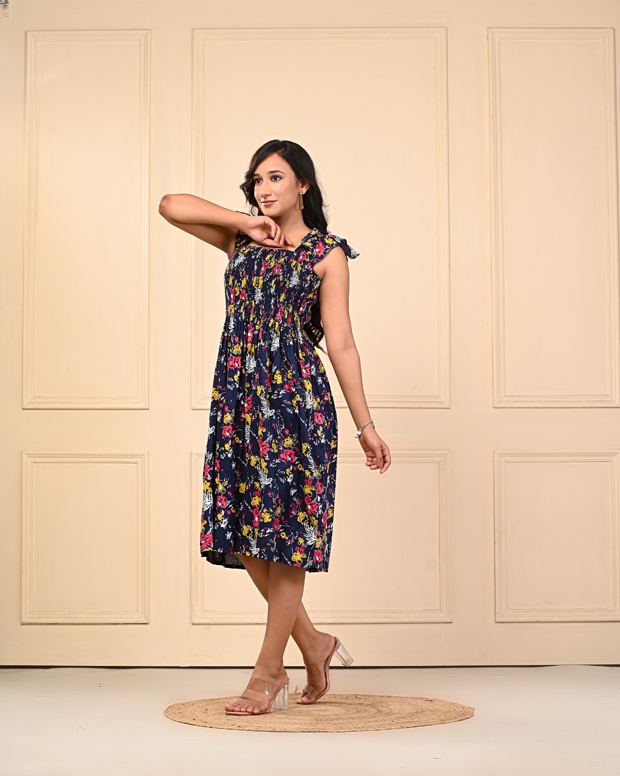 Add a touch of feminine charm to your wardrobe with this beautiful magenta blue floral smocked midi dress. Designed to flatter all body types, this dress features a fully smocked bodice that offers a snug yet stretchy fit, enhancing your silhouette comfortably. The flowy midi-length skirt drapes elegantly, making it perfect for warm-weather outings or casual gatherings.