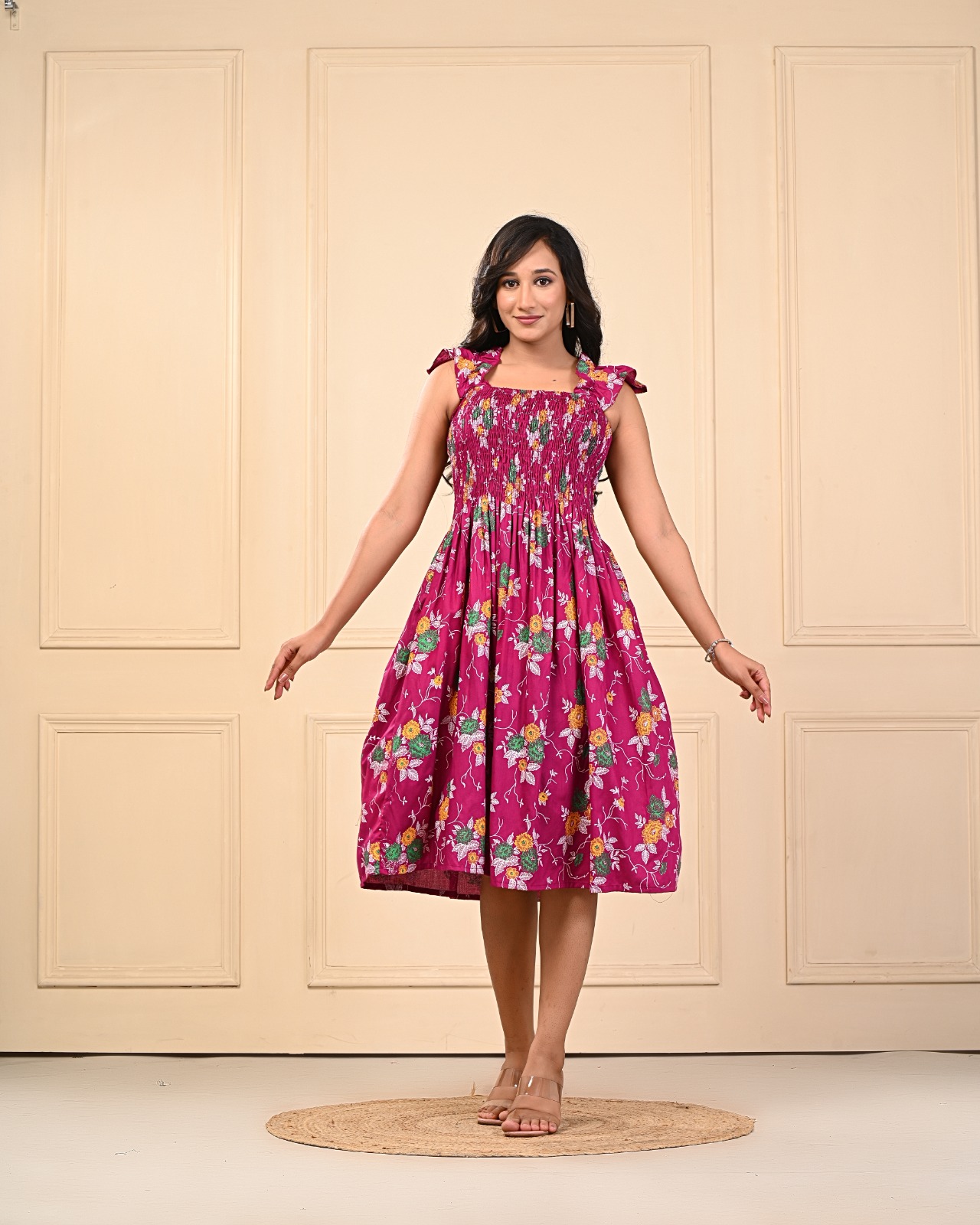 Add a touch of feminine charm to your wardrobe with this beautiful magenta pink floral smocked midi dress. Designed to flatter all body types, this dress features a fully smocked bodice that offers a snug yet stretchy fit, enhancing your silhouette comfortably. The flowy midi-length skirt drapes elegantly, making it perfect for warm-weather outings or casual gatherings.