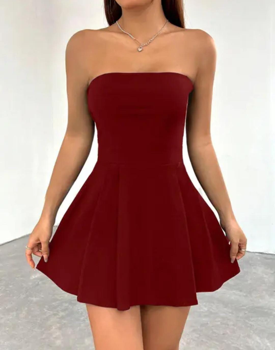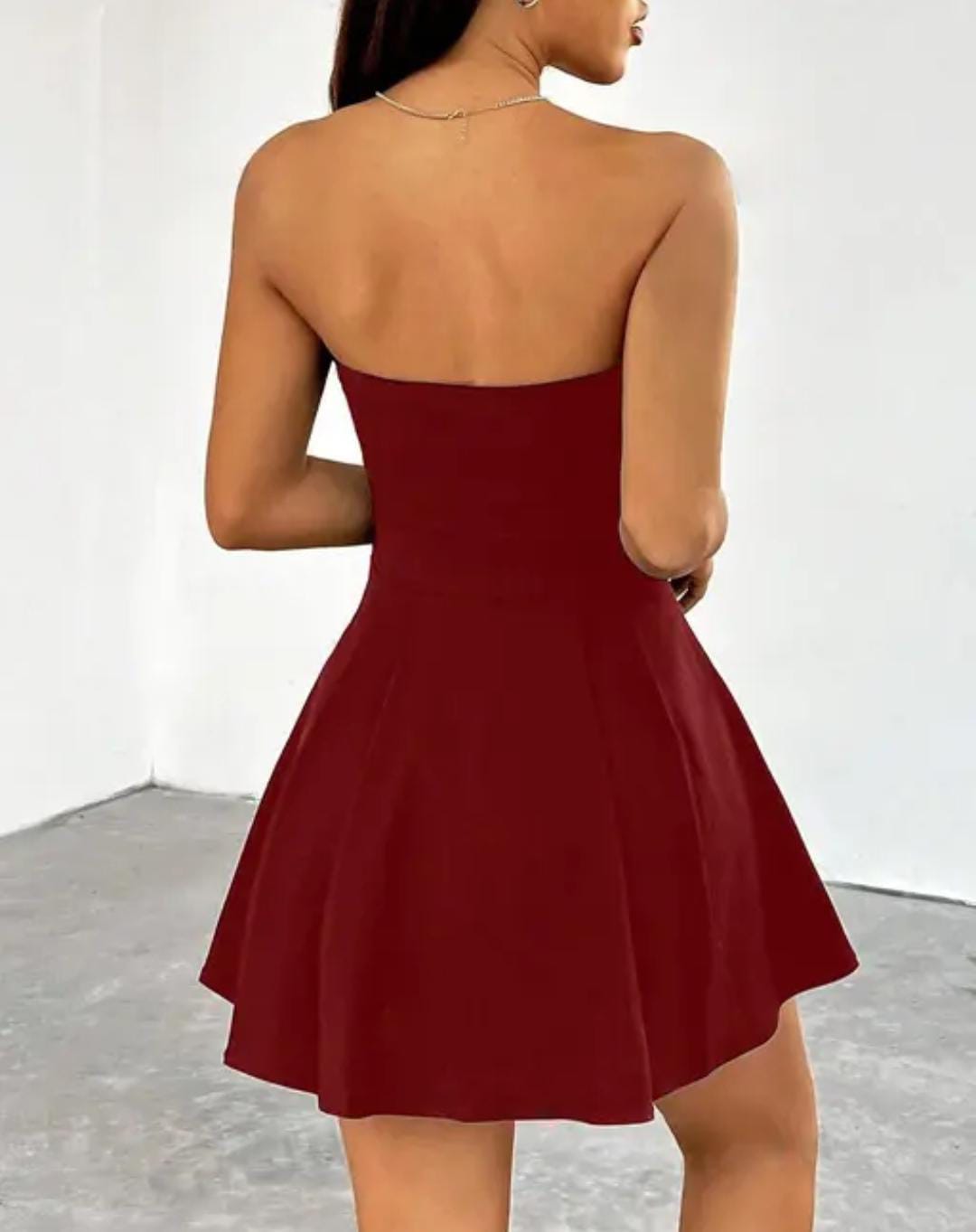 This red strapless skater dress offers a chic and feminine look. Designed with a strapless neckline and a flared skater silhouette, it beautifully enhances the waist while giving a graceful flow to the skirt.